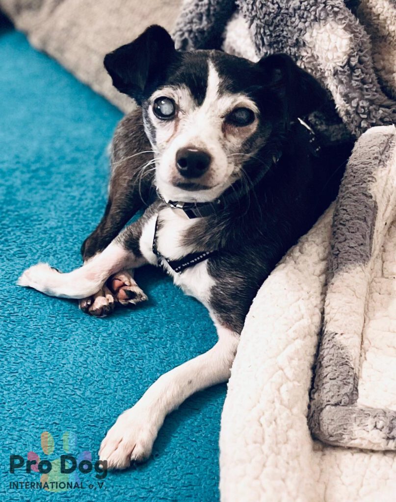 Eddie ist blind, aber er kommt damit sehr gut zurecht. Für sein Alter ist der kleine Schmusebär sehr fit. Er liebt es, spazieren zu gehen – gerne auch länger. Dabei orientiert er sich an seinem Pflegefrauchen. Ab und an streicht er ihr Beinchen, so dass er weiß, dass sein Pflegefrauchen noch da ist und dann geht er locker flockig weiter. Eddie kann sehr gut hören und riechen. Er orientiert sich an Geräuschen und Gerüchen. Zudem kommuniziert Eddie mit seinem Pflegefrauchen – er hat seine eigene ganz niedliche Hundesprache.